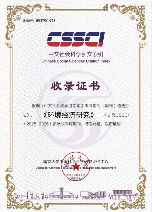 《环境经济研究》为CSSCI(2025-2026)扩展版来源期刊;“中国人文社会科学期刊AMI综合评价”核心期刊;《中国学术期刊影响因子年报(人文社会科学)》一区期刊;国家哲学社会科学文献中心“经济学最受欢迎期刊”;“中国国际影响力优秀学术期刊”(中国知网评价中心);RCCSE中国核心学术期刊(A-);中国人民大学“复印报刊资料重要转载来源期刊”;湖北省优秀期刊。
